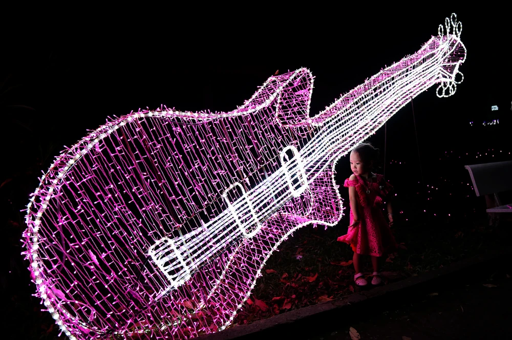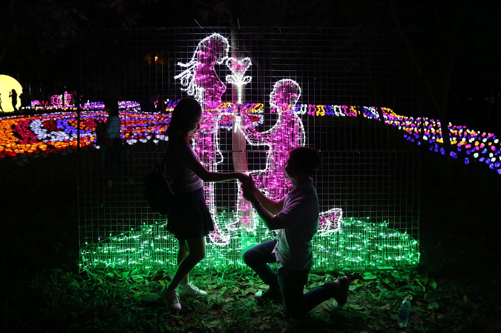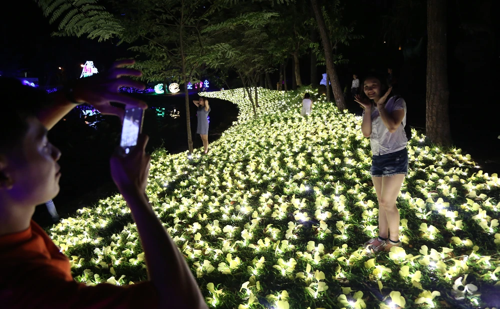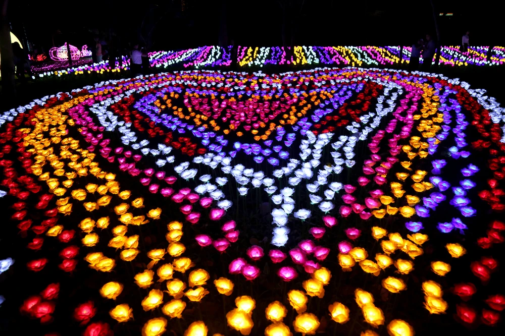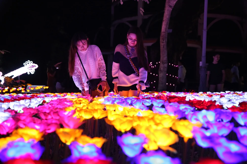 Dọc bờ hồ trong khuôn viên Thảo Cầm Viên là cánh đồng hoa rực sáng bởi hiệu ứng đèn LED.