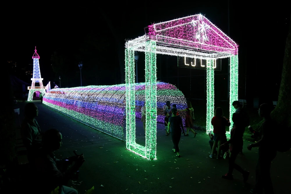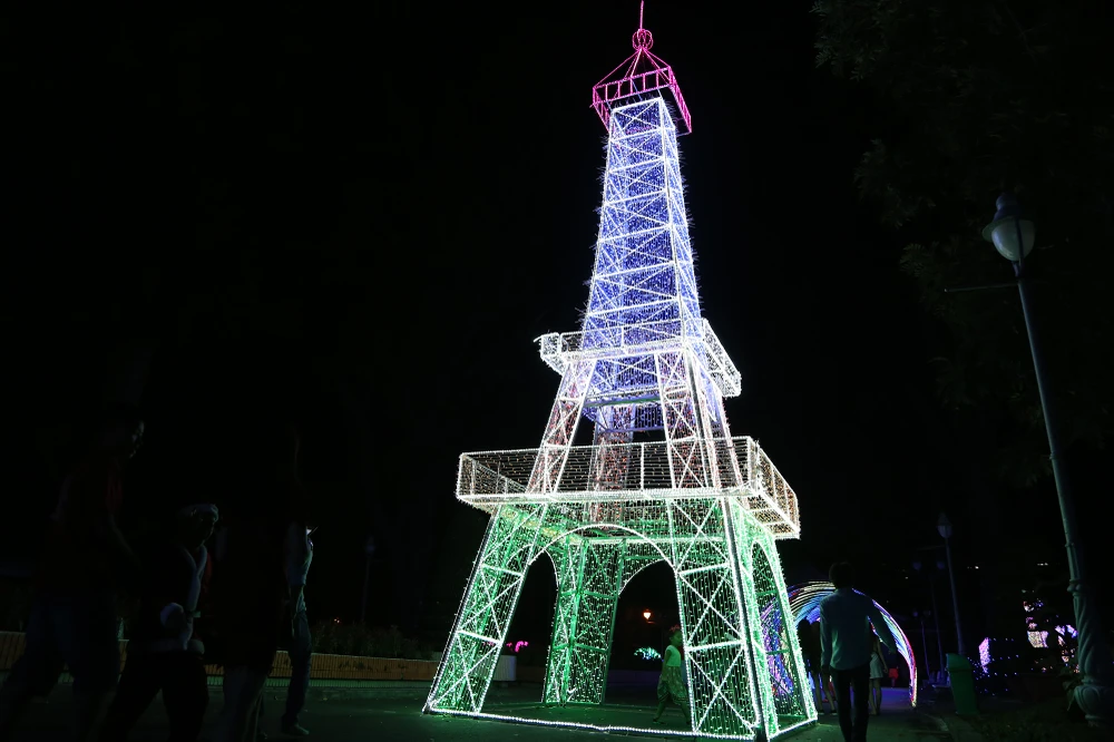Với quy mô lên đến hàng triệu bóng đèn LED được tạo hình các địa danh nổi tiếng thế giới, đèn ba chiều công nghệ cao, các loại đèn tạo hình động vật, 9.999 đóa hoa hồng... Trong ảnh: Mô hình tháp Eiffel nước Pháp bằng đèn LED lộng lẫy, nhiều màu sắc.