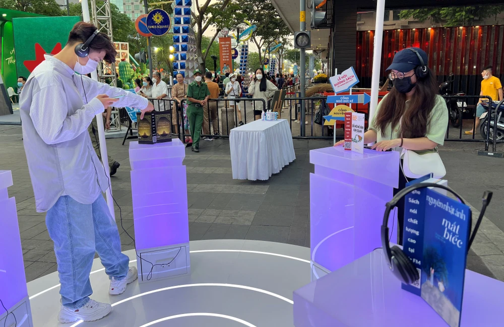 Người dân có thể thoả sức nghe nhiều dòng sách khác nhau tại "Toa tàu tương lai" ở Đường sách Nguyễn Văn Bình. Ảnh: CTV