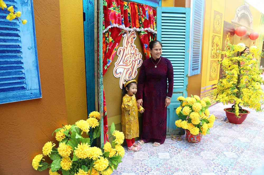 Hai bà cháu diện áo dài chụp ảnh bên những tiểu cảnh xuân ở nhà văn hóa Thanh Niên.