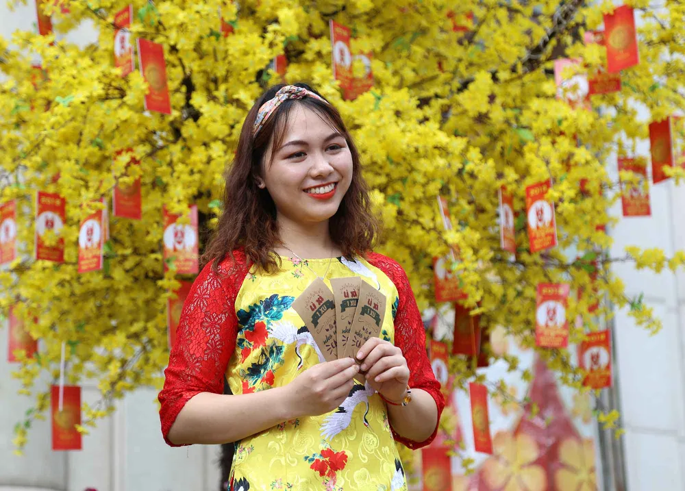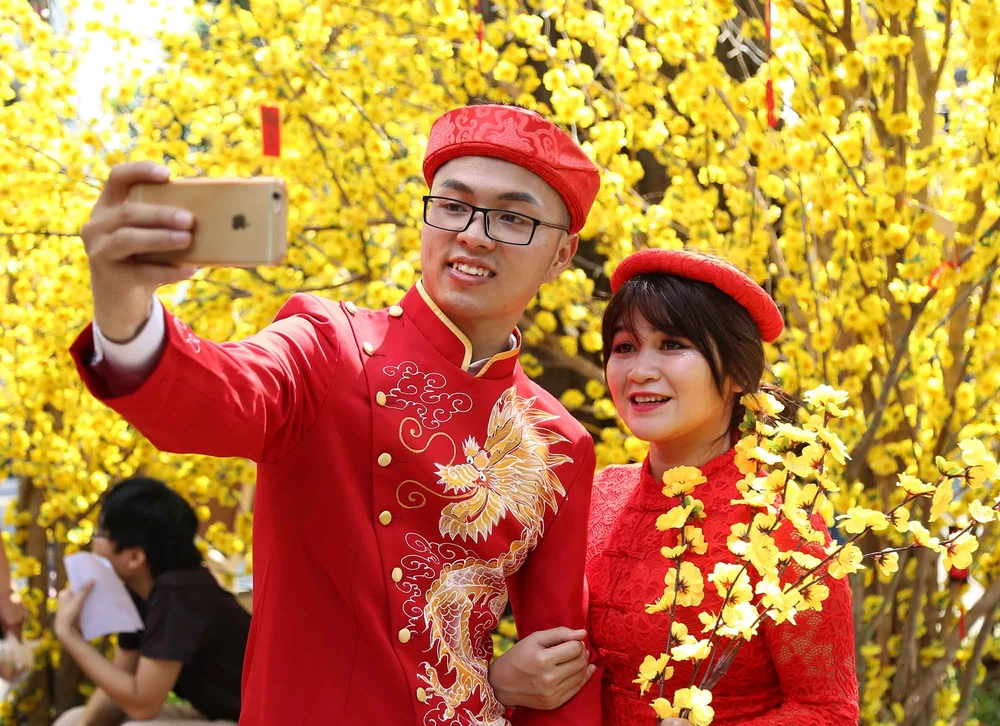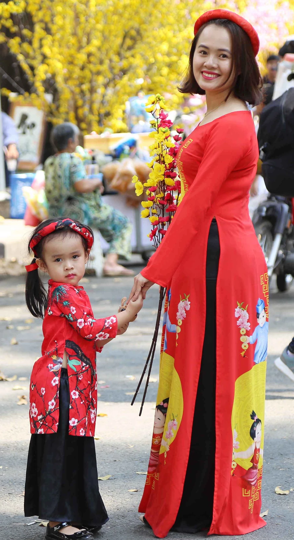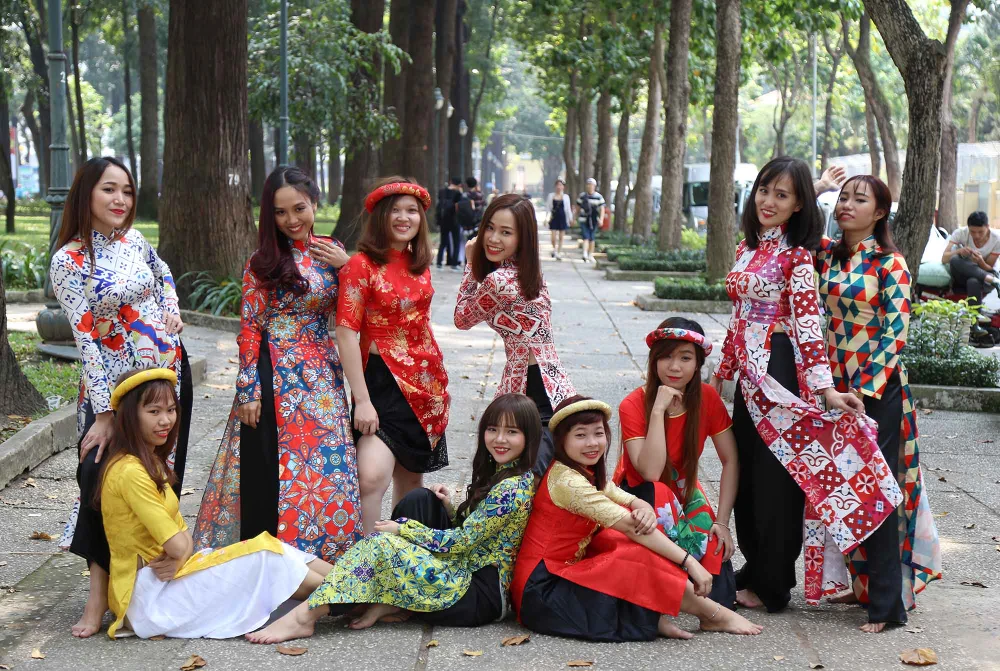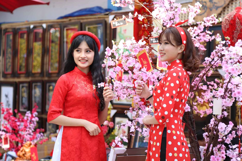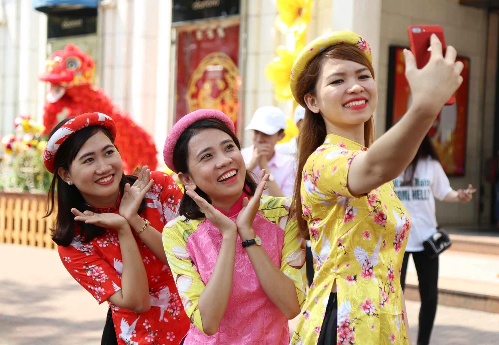 Tranh thủ ngày cuối tuần, nhóm bạn trẻ diện áo dài, khăn đóng rực rỡ xuống phố chụp ảnh lưu niệm trước khi về quê ăn Tết cùng với gia đình.