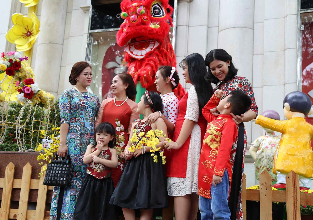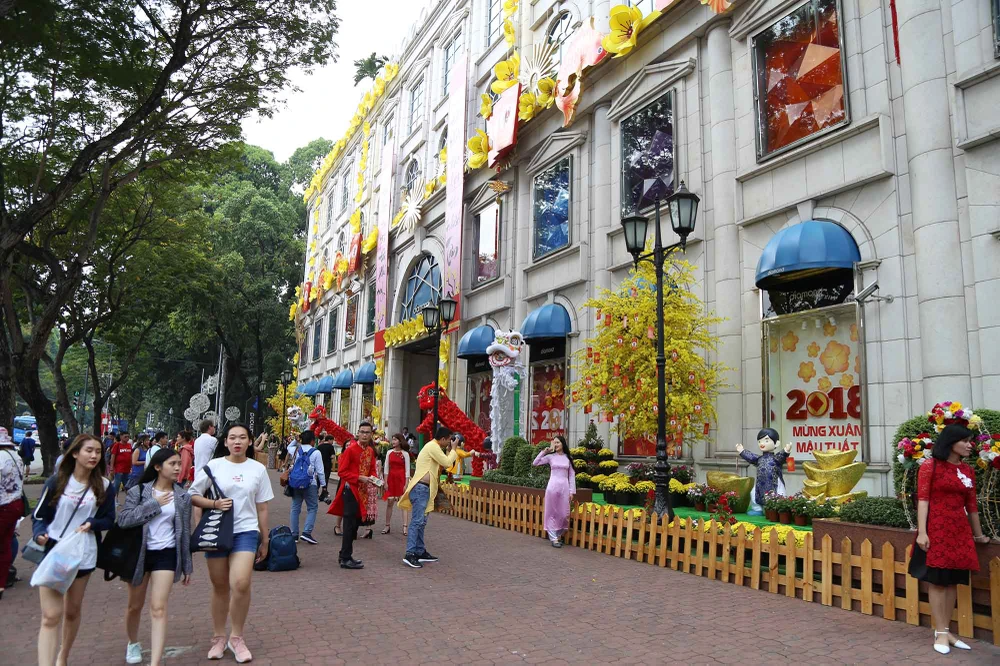 Trung tâm thương mại Diamond (đường Lê Duẩn, quận 1) những ngày cận Tết Nguyên Đán Mậu Tuất 2018 được trang trí lộng lẫy với sắc vàng của hoa mai, ông lân và nhiều tiểu cảnh vui nhộn thu hút rất nhiều gia đình, giới trẻ đến vui chơi, chụp ảnh.