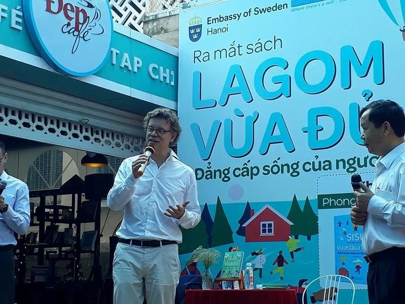Đại sứ Thụy Điển giới thiệu văn hóa của nước ông qua quyển sách dịch Lagom đến giới trẻ TP.HCM. Ảnh: Hòa Bình.
