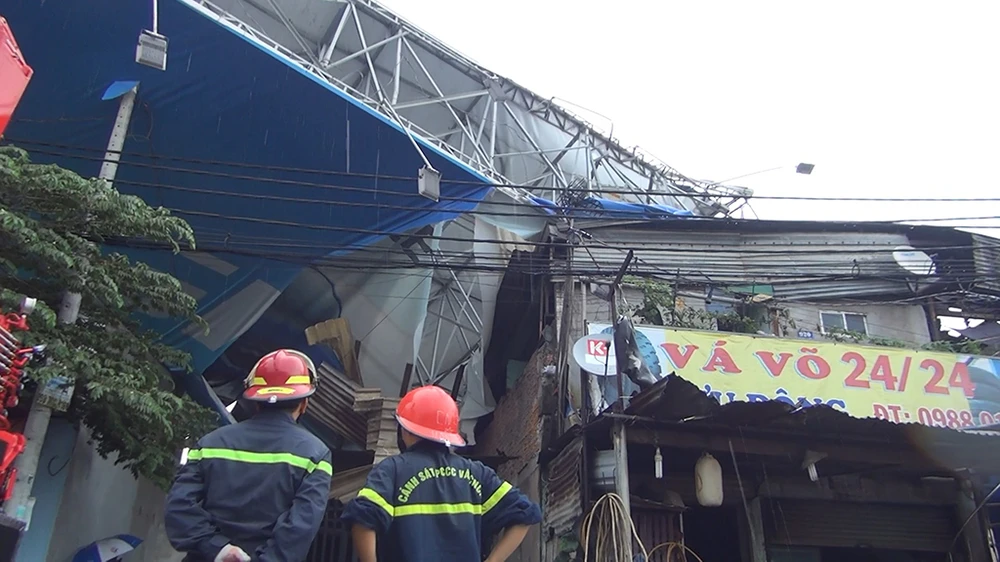 Đến cuối giờ chiều 10-8, lực lượng chức năng quận Bình Tân, TP.HCM phối hợp với đơn vị cứu hộ cứu nạn thuộc Cảnh sát PCCC TP.HCM triển khai công tác cứu hộ, xử lý hiện trường vụ sập biển quảng cáo xảy ra trên địa bàn.