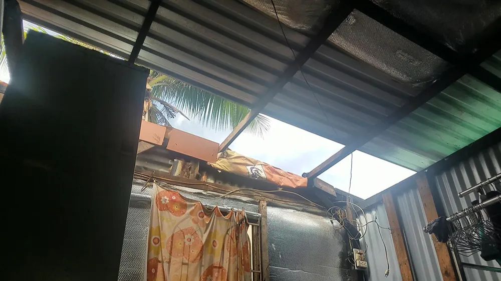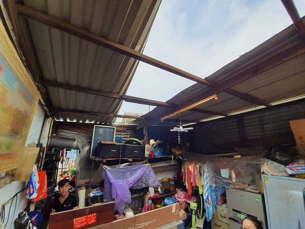 “Gió lốc giật phăng mái tôn kêu đánh đùng, một phần nhà hư hỏng. Tôi bị kẹt, phải ráng chui ra ngoài” – bà Hiền chưa hết thảng thốt kể.