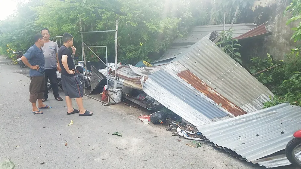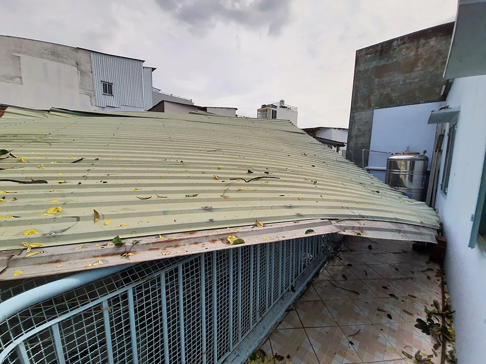 Mái tôn của một ngôi nhà rơi trúng nơi ở của bà Nguyễn Thị Hà (62 tuổi) khiến người phụ nữ hoảng hốt, tưởng sét đánh. Ghi nhận, phần mái tôn có chiều ngang chừng năm mét, dài khoảng tám mét nằm trên nhà bà Hà và gá sang nhà hàng xóm gần đó.