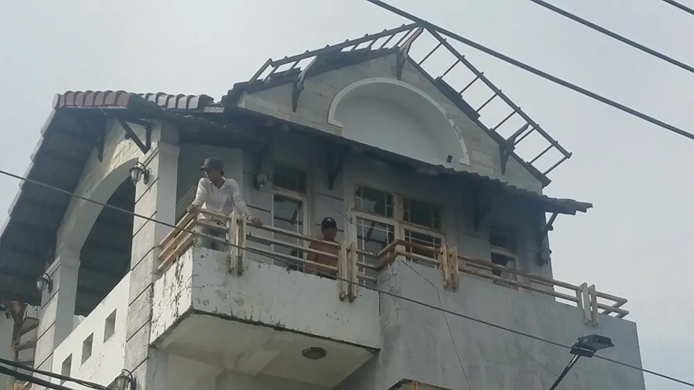 Mái tôn bị gió thổi bay vắt lên đường dây điện và nhà dân ở quận 8.