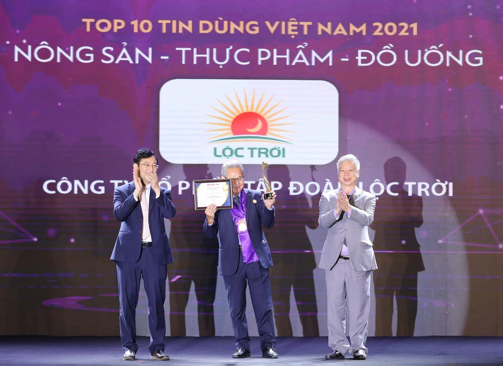 Ông Huỳnh Văn Thòn, Chủ tịch HĐQT Tập đoàn Lộc Trời (giữa) nhận giải thương tôn vinh trong Top 10 Tin Dùng Việt Nam 2021.
