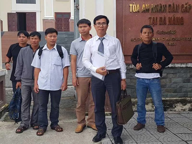 Năm công dân trong vụ “cưa gỗ khô” cùng luật sư (người đeo cà vạt) trước trụ sở TAND Cấp cao tại Đà Nẵng. Ảnh: NGÂN NGA