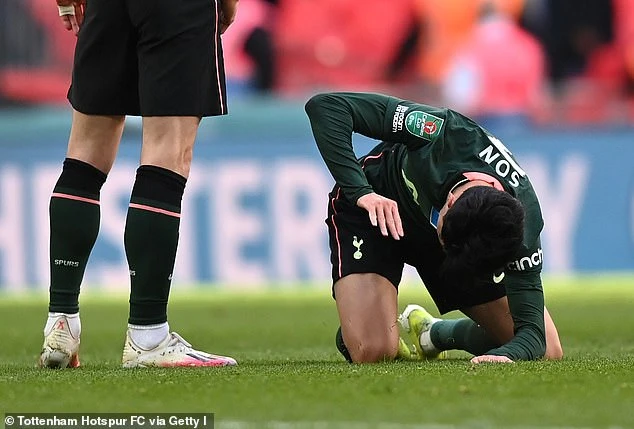 Son Heung-min gục xuống sân khóc. ẢNH: GETTY