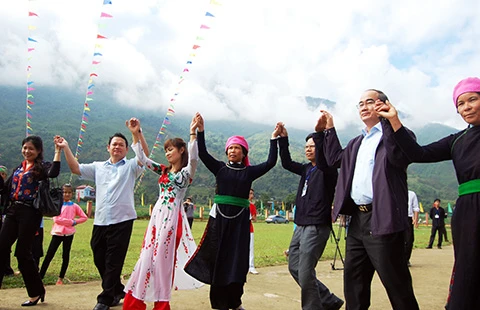 Chủ tịch Ủy ban Trung ương MTTQ Việt Nam Nguyễn Thiện Nhân (thứ hai từ phải sang) nhảy điệu xòe cùng bà con dân tộc Tày, Dáy, Xa Phó tại thôn Tượng 1, thôn Tượng 3, xã Hợp Thành, TP Lào Cai trong ngày hội Đại đoàn kết toàn dân, ngày 13-11. Ảnh: C.LUẬN