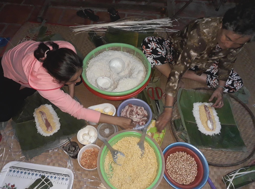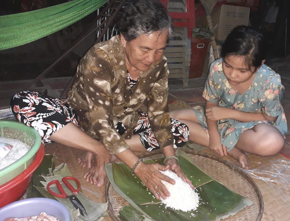 Năm nay cũng vậy, gà vừa gáy canh tư là bà Hai lọ mọ thức dậy rồi bày biện nào lá chuối, nếp, đậu, thịt, trứng… trên chiếu cói để gói bánh. Vài người con phụ giúp, trong khi đám cháu ngồi quanh nhìn nội và cô chú gói bánh.