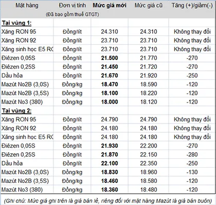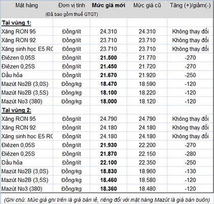 Theo thông tin vừa được đại diện Petrolimex chính thức thông báo, dầu diesel 0,05S và dầu hỏa trong hệ thống sẽ có mức giảm lần lượt là 270 đồng/lít và 250 đồng/lít. Theo đó, mức giá mới tại vùng 1 của hai mặt hàng này lần lượt là 21.500 đồng/lít và 21.670 đồng/lít.