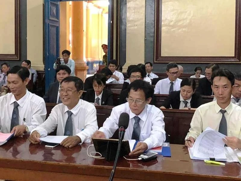 Luật sư Phạm Công Út (người ngồi giữa ngay miro) tại một phiên tòa.