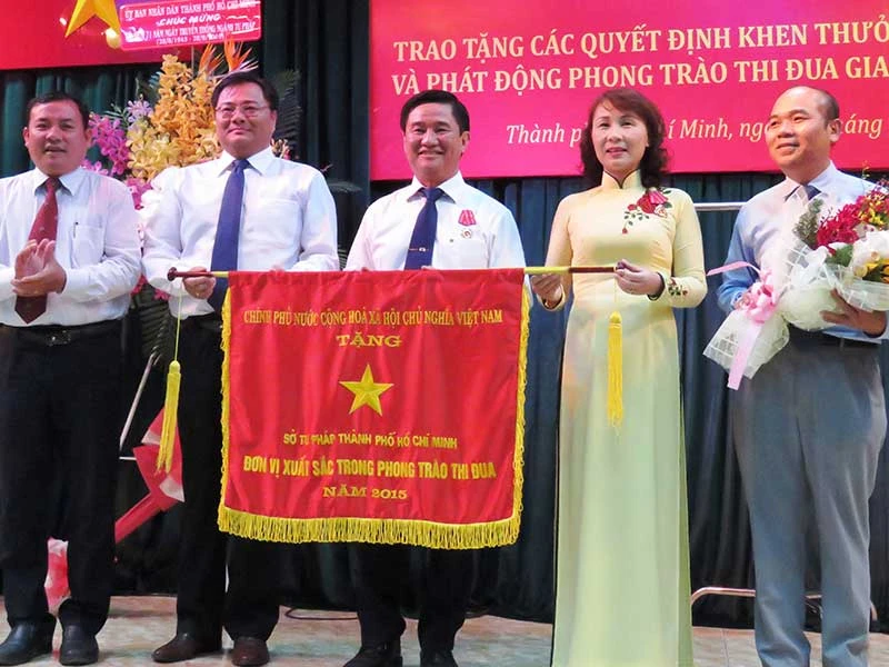 Năm 2016, Sở Tư pháp TP.HCM được Chính phủ tặng cờ do có thành tích xuất sắc. Ảnh: LT