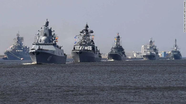 Tàu khu trục Đô đốc Gorshkov (thứ hai bên trái) cùng các tàu chiến khác trong buổi tập dợt chuẩn bị lễ duyệt binh Ngày Hải quân Nga. Ảnh: CNN