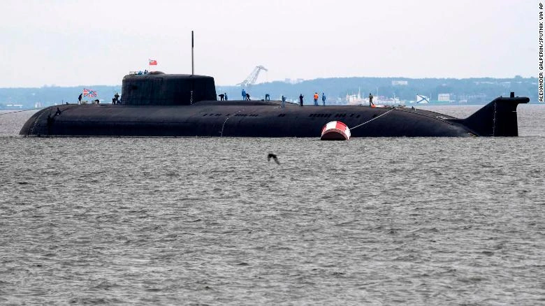 Tàu ngầm mang tên lửa chạy bằng năng lượng hạt nhân Oryol là tàu lớn nhất trong lễ duyệt binh hải quân Nga năm nay. Ảnh: CNN