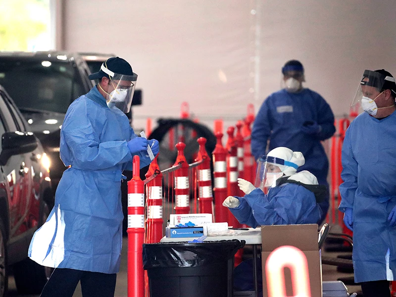Nhân viên y tế tại một trạm xét nghiệm COVID-19 lưu động trước một điểm bỏ phiếu ở TP Los Angeles, bang California ngày 4-11. Ảnh: REUTERS