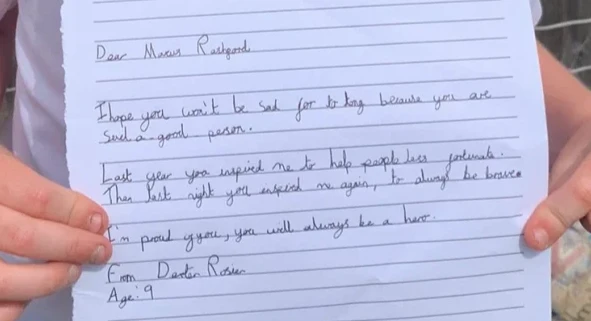 Trong hàng ngàn thông điệp của tình thương, Dexter Rosier – một CĐV nhí 9 tuổi viết một bức thư tay rất chân thành gửi cho Rashford: “Marcus Rashford thân mến. Tôi hy vọng anh sẽ không buồn lâu vì anh là một người tốt như vậy. Năm ngoái anh đã truyền cảm hứng cho tôi để giúp đỡ những người kém may mắn. Vậy thì đêm qua, anh lại truyền cảm hứng cho tôi, hãy luôn dũng cảm. Tôi tự hào về anh, anh sẽ luôn là một anh hùng. Từ Dexter Rosier”.