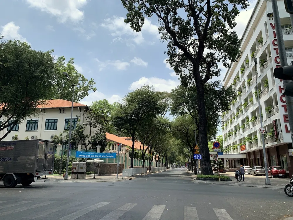 Ngã tư Võ Văn Tần - Nam Kỳ Khởi Nghĩa với trường Lê Quý Đôn (trái) và khách sạn Victory (phải) vào 10 giờ 30 sáng 30-3. Ảnh: Q.T