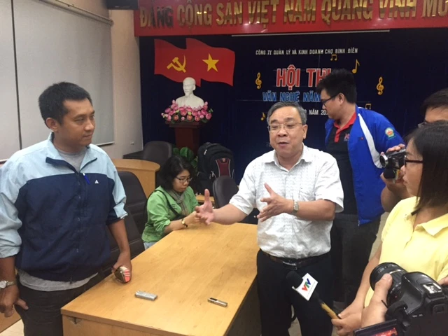 Ông Nguyễn Ngọc Hòa, Phó Giám đốc Sở Công Thương (phải); ông Sìn, Phó Giám đốc chợ đầu mối Bình Điền, trả lời báo chí về việc "vỡ trận" tại chợ.