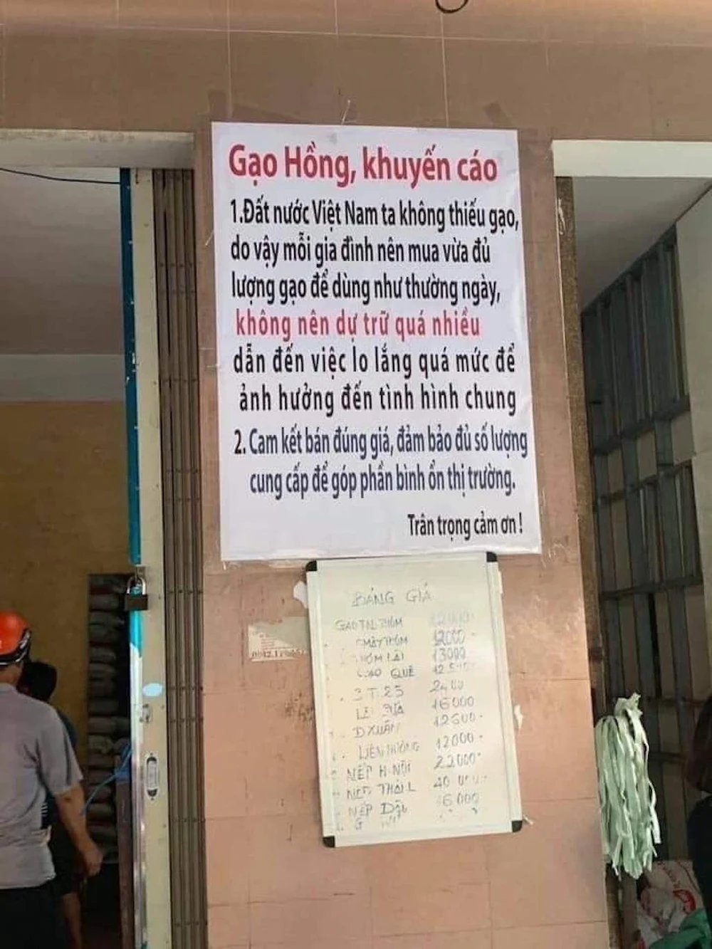 Cùng với lời khuyên là ngay trước cửa, chủ tiệm treo một biển lớn: "Đất nước Việt Nam ta không thiếu gạo. Do vậy mỗi gia đình nên mua vừa đủ lượng gạo để dùng như thường ngày, không nên dự trữ quá nhiều dẫn đến việc lo lắng quá mức để ảnh hưởng đến tình hình chung".