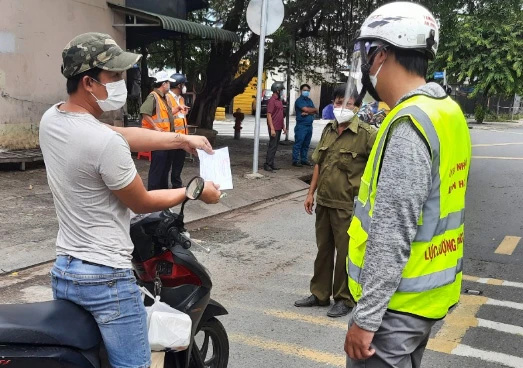 Chính quyền địa phương xã Trung Chánh tổ chức chốt kiểm soát người ra vào để phòng, chống dịch COVID-19. Ảnh: TRẦN NGỌC