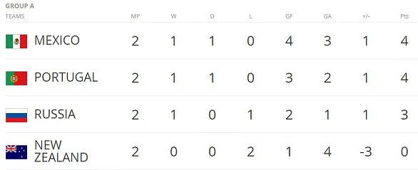 Bồ Đào Nha gần như đã chắc suất ở bảng này khi lượt cuối chỉ gặp một New Zealand là đội lót đường và đã bị loại. Suất còn lại là cuộc cạnh tranh giữa chủ nhà Nga và Mexico. Nga rơi vào thế khó khi buộc phải thắng Mexico ở lượt cuối mới có vé đi tiếp.