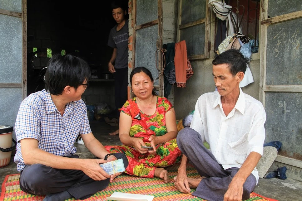 Nhà báo Đức Hiển trao tiền hỗ trợ cho anh Lam. Ảnh: T.Sơn
