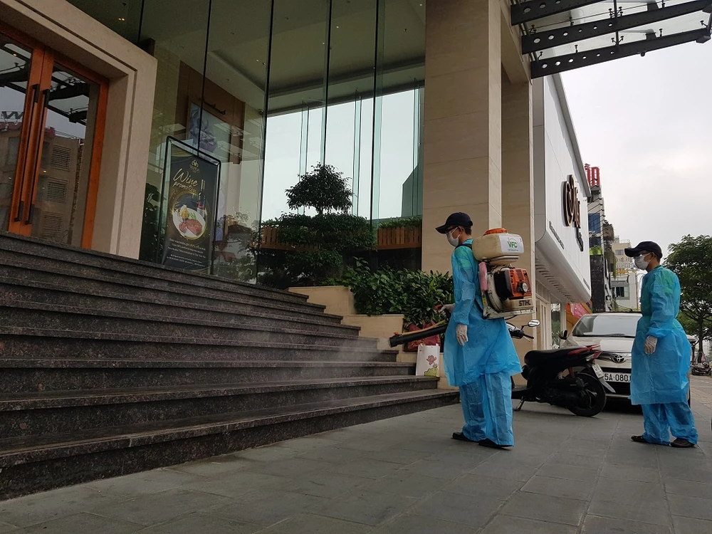 Lực lượng chức năng tiến hành phun khử trùng khách sạn Vanda. Ảnh: TA