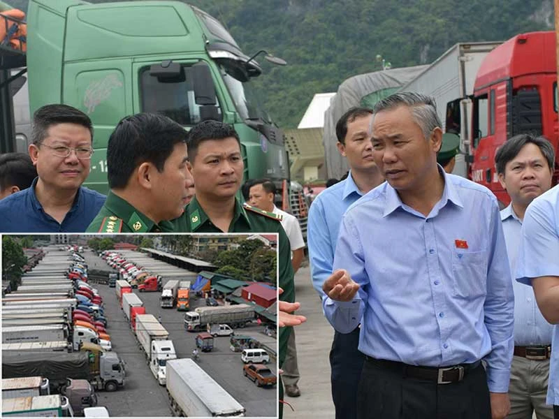 Thứ trưởng Bộ NN&PTNT Phùng Đức Tiến (bìa phải) kiểm tra thực tế tình hình ùn tắc nông sản ở cửa khẩu Lạng Sơn (ảnh lớn). Hàng trăm xe nông sản bị tắc ở cửa khẩu (ảnh nhỏ). Ảnh: KHƯƠNG LỰC