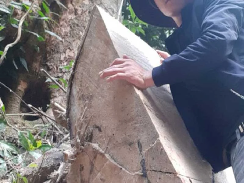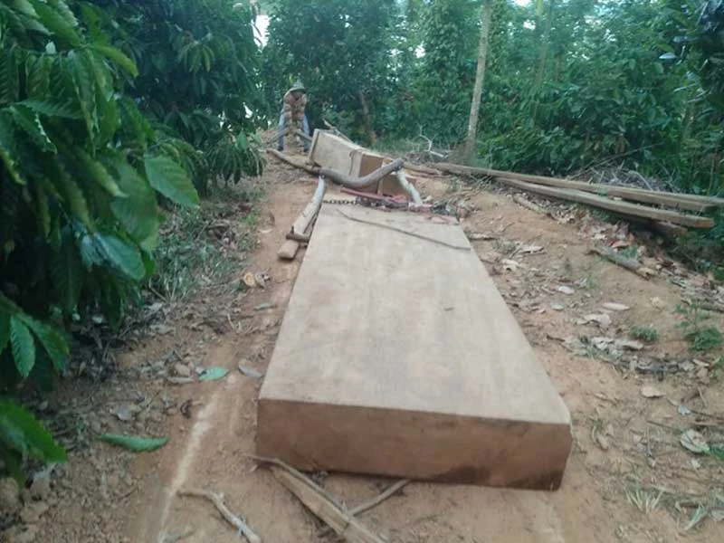 Không những thế, cách bìa rừng chừng hơn 3 km, nơi đường dốc quanh co, là một công trường gỗ với hàng loạt tấm ván có đường kính rất lớn. Nhiều cây cổ thụ có tuổi đời trăm năm, đường kính 1,2-1,5 m bị cưa xẻ với dấu vết còn mới. Nơi đây nhiều vật dụng như chai nước uống, vỏ đồ ăn, thước đo… nằm lăn lóc.