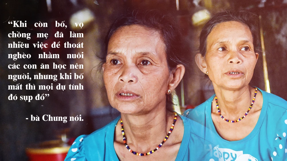Đó là ngày cách đây bảy năm trước, bà Chưng không nhớ rõ ngày tháng, chỉ nhớ “hôm đó bà con trong bản ai cũng nghỉ làm để đến phụ giúp”. “Khi còn bố, vợ chồng mẹ đã làm nhiều việc để thoát nghèo nhằm nuôi các con ăn học nên người, nhưng khi bố mất thì mọi dự tính đó sụp đổ” - bà Chưng nói.