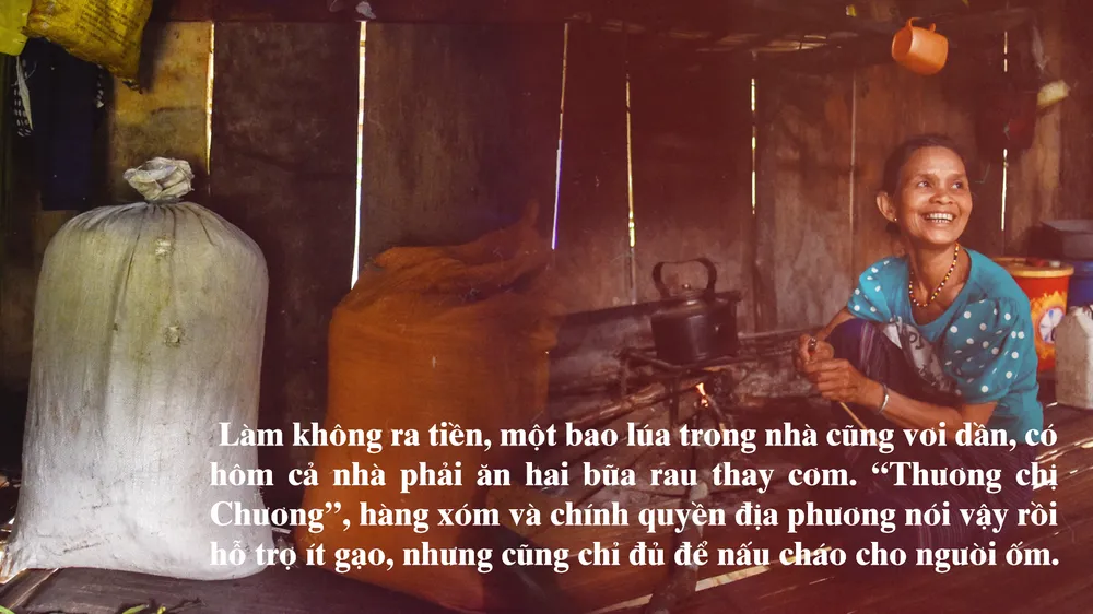 Cái nghèo khổ dường như không chịu buông người góa phụ, đứa con gái của bà Chưng lại đau ốm liên miên, bà lại vay mượn tiền để chữa trị. Rồi bà Chưng cũng đau theo. Làm không ra tiền, một bao lúa trong nhà cũng vơi dần, có hôm cả nhà phải ăn hai bữa rau thay cơm. “Thương chị Chương” - hàng xóm và chính quyền địa phương nói vậy rồi hỗ trợ ít gạo, nhưng cũng chỉ đủ để nấu cháo cho người ốm.