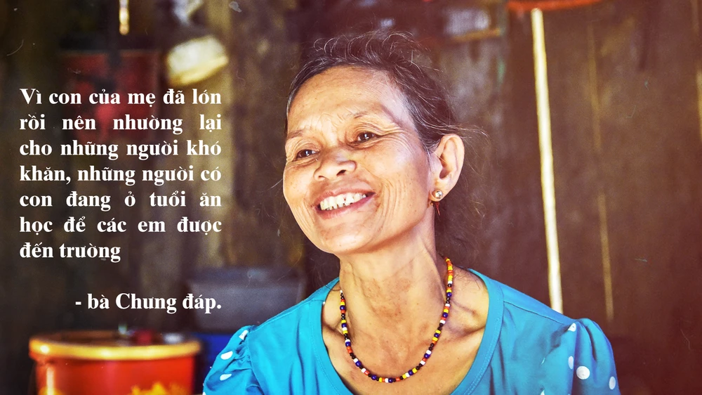- "Vì con của mẹ đã lớn rồi, nên nhường lại cho những người khó khăn, những người có con đang ở tuổi ăn học để các em được đến trường" - bà Chưng đáp.