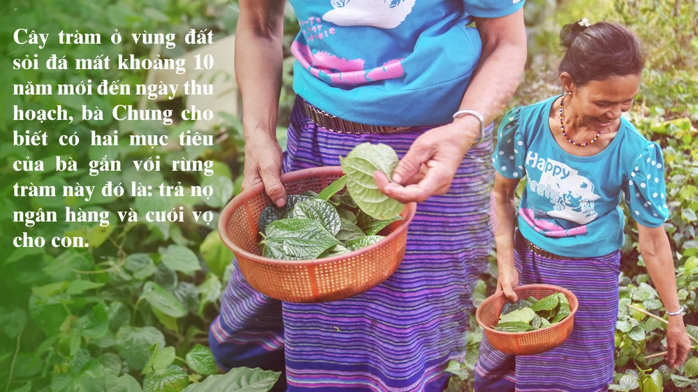 Cây tràm ở vùng đất sỏi đá mất khoảng 10 năm mới đến ngày thu hoạch, bà Chưng cho biết có hai mục tiêu của bà gắn với rừng tràm này, đó là: trả nợ ngân hàng và cưới vợ cho con.