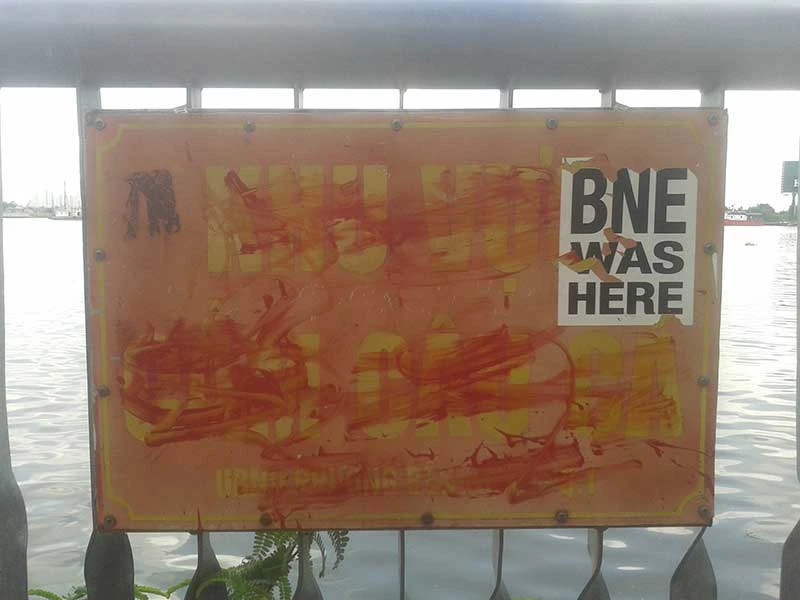 Ngoài ra, một tấm sticker của trào lưu tranh đường phố “nặc danh” BNE nổi tiếng toàn cầu cũng chễm chệ ngự trên một góc bảng cấm. Nhiều TP khác trên thế giới cũng đã được BNE “ghé thăm” và trào lưu dán sticker này từng bị chính quyền nhiều TP xem là hành vi phá hoại tài sản công. Tuy vậy phong trào này vẫn tồn tại suốt 15 năm qua. (Ảnh chụp chiều 4-9).