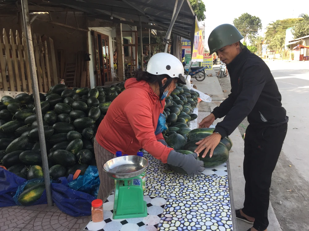 Do không xuất đi Trung Quốc được, chị Loan lập điểm bán dưa hấu tại xã Hành Thuận, huyện Nghĩa Hành (Quảng Ngãi). Ảnh: VÕ QUÝ