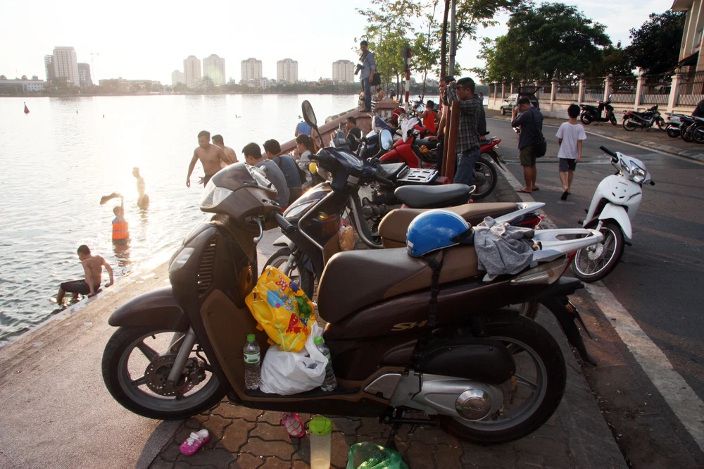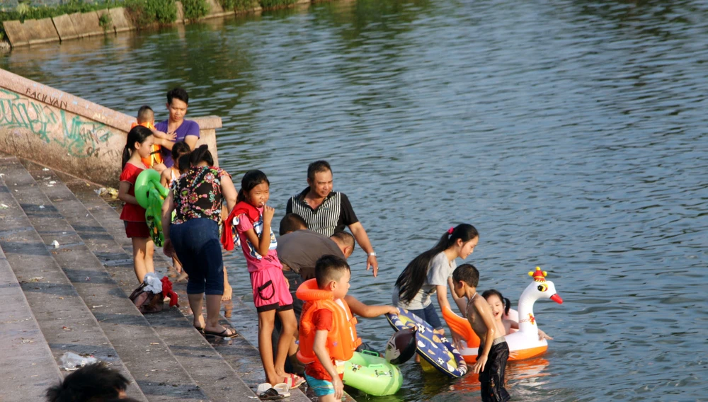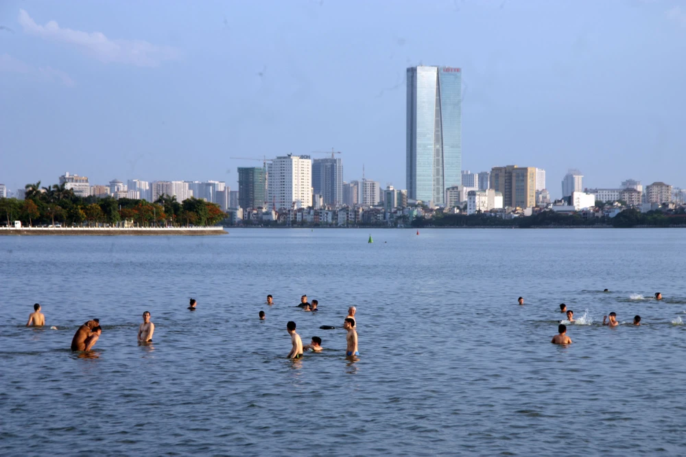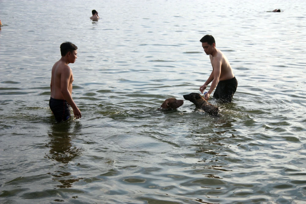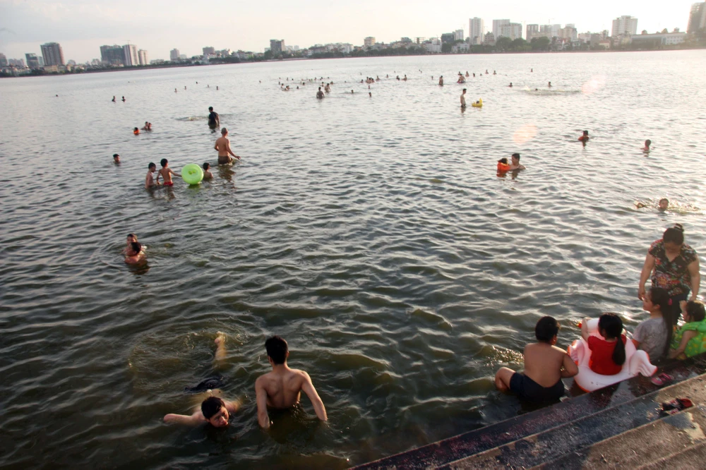 Cả một góc hồ Tây được người dân Hà Nội chọn làm "bãi tắm" trong những ngày nắng nóng kỷ lục
