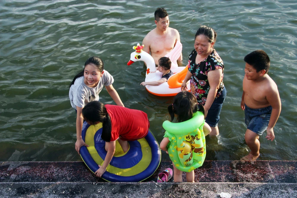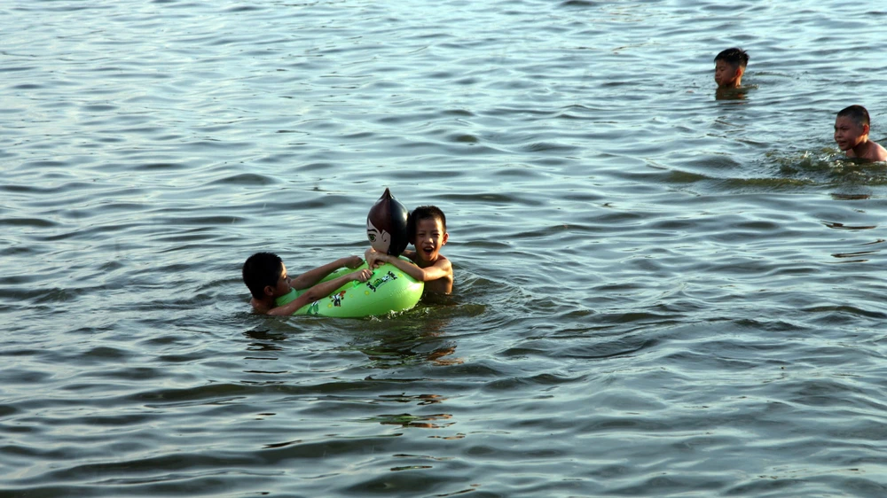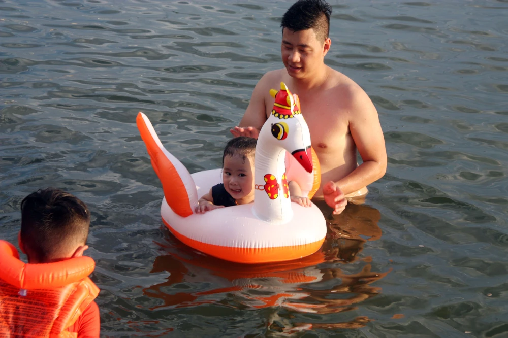 Từ người lớn, trẻ nhỏ đều rất háo hứng tắm hồ mỗi khi chiều đến