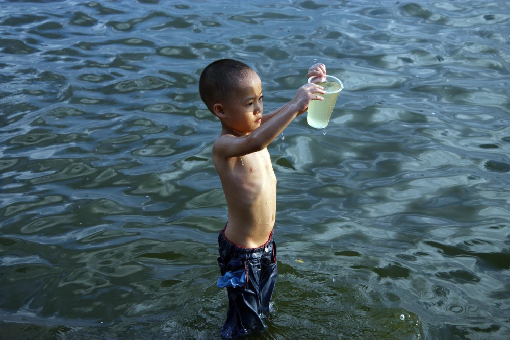 Một cháu nhỏ đang mải mê nghịch nước bên ven bờ hồ