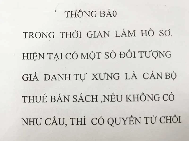 Tại quầy tiếp nhận và trả kết quả lĩnh vực kinh tế, bộ phận một cửa UBND quận Bình Tân (TP.HCM), các chuyên viên Phòng Kinh tế thường phát cho người dân mảnh giấy có nội dung “Trong thời gian làm hồ sơ, có một số đối tượng giả danh là cán bộ thuế bán sách. Nếu không có nhu cầu thì có quyền từ chối”.