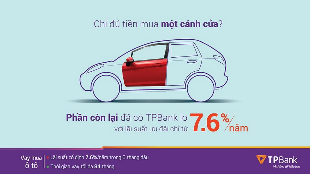 Là ngân hàng dẫn đầu thị trường nhiều năm liền về chất lượng và tốc độ tăng trưởng, Ngân hàng TMCP Tiên Phòng (TPBank) đang triển khai gói vay siêu ưu đãi dành cho khách hàng mua ô tô với lãi suất ưu đãi và có thể vay tới 80% giá trị xe. Gói vay được áp dụng đồng thời cho cả dòng xe đi lại dưới 9 chỗ/xe thương mại mới và dòng xe cũ đã qua sử dụng.