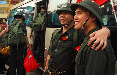 Thanh niên TP.HCM lên đường nhập ngũ tại một điểm giao quân ở quận 5. Ảnh: HTD