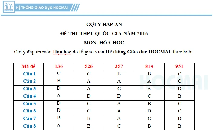 (*) Gợi ý đáp án môn Hóa học do tổ giáo viên Hệ thống Giáo dục HOCMAI thực hiện.