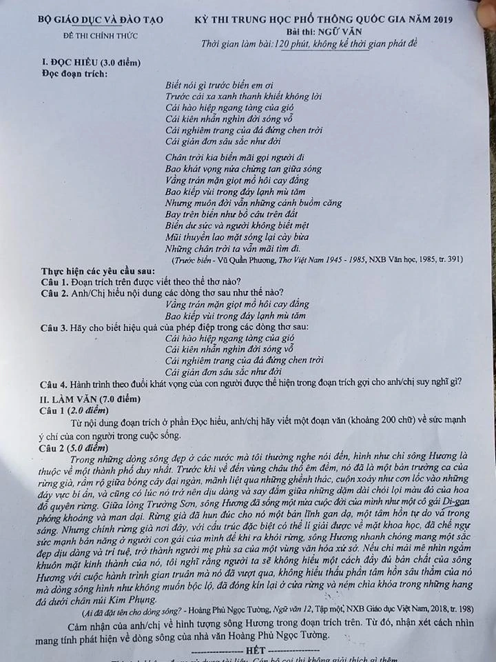 Đề thi môn Văn kỳ thi THPT quốc gia 2019.