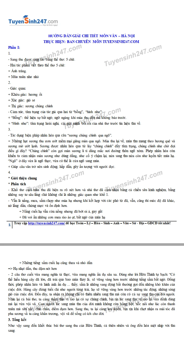 Ở phần I, đề thi hỏi về bài thơ Sang thu của Hữu Thỉnh, các câu hỏi đều kiểm tra các kiến thức cơ bản với những dạng khá quen thuộc như xác định thể thơ, phân tích tác dụng của phép tu từ. Câu 4 yêu cầu viết đoạn văn cảm nhận khổ thơ cuối bài, chiếm trọng số điểm cao nhất của đề thi, đòi hỏi thí sinh trình bày bài không chỉ đủ ý, mạch lạc mà còn phải đảm bảo các yêu cầu về hình thức đoạn văn, tiếng Việt.