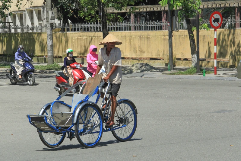 Những người đạp xích lô dù được trang bị thêm nón lá, áo dài tay nhưng vẫn cảm thấy mệt mỏi trong cái nắng như đổ lửa. Ảnh: NGUYỄN DO