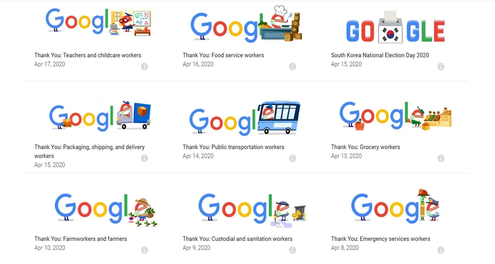 Google cũng tôn vinh nhân viên cửa hàng tạp hóa; nhân viên vận tải công cộng; các nhân viên đóng gói, vận chuyển và giao hàng; các nhân viên trong ngành dịch vụ ăn uống; các giáo viên và bảo mẫu..