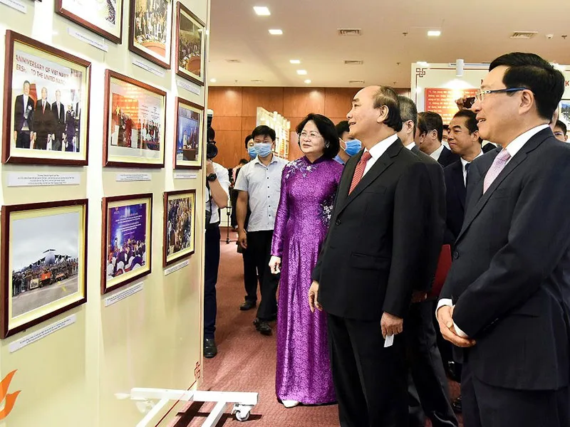 Thủ tướng Nguyễn Xuân Phúc tham quan Nhà truyền thống và bộ tranh chân dung các bộ trưởng Bộ Ngoại giao qua các thời kỳ. Ảnh: VT